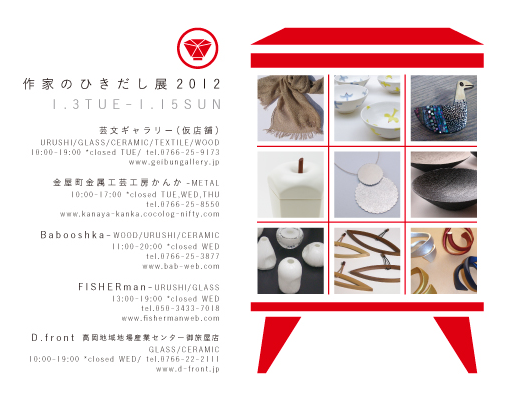 © 2011 有限会社千葉工作所. All rights reserved. 作家のひきだし展2012 25 Dec ’11 出品します。 くわしい内容はこちらから。 主催の芸文ギャラリーのサイトはこちら。