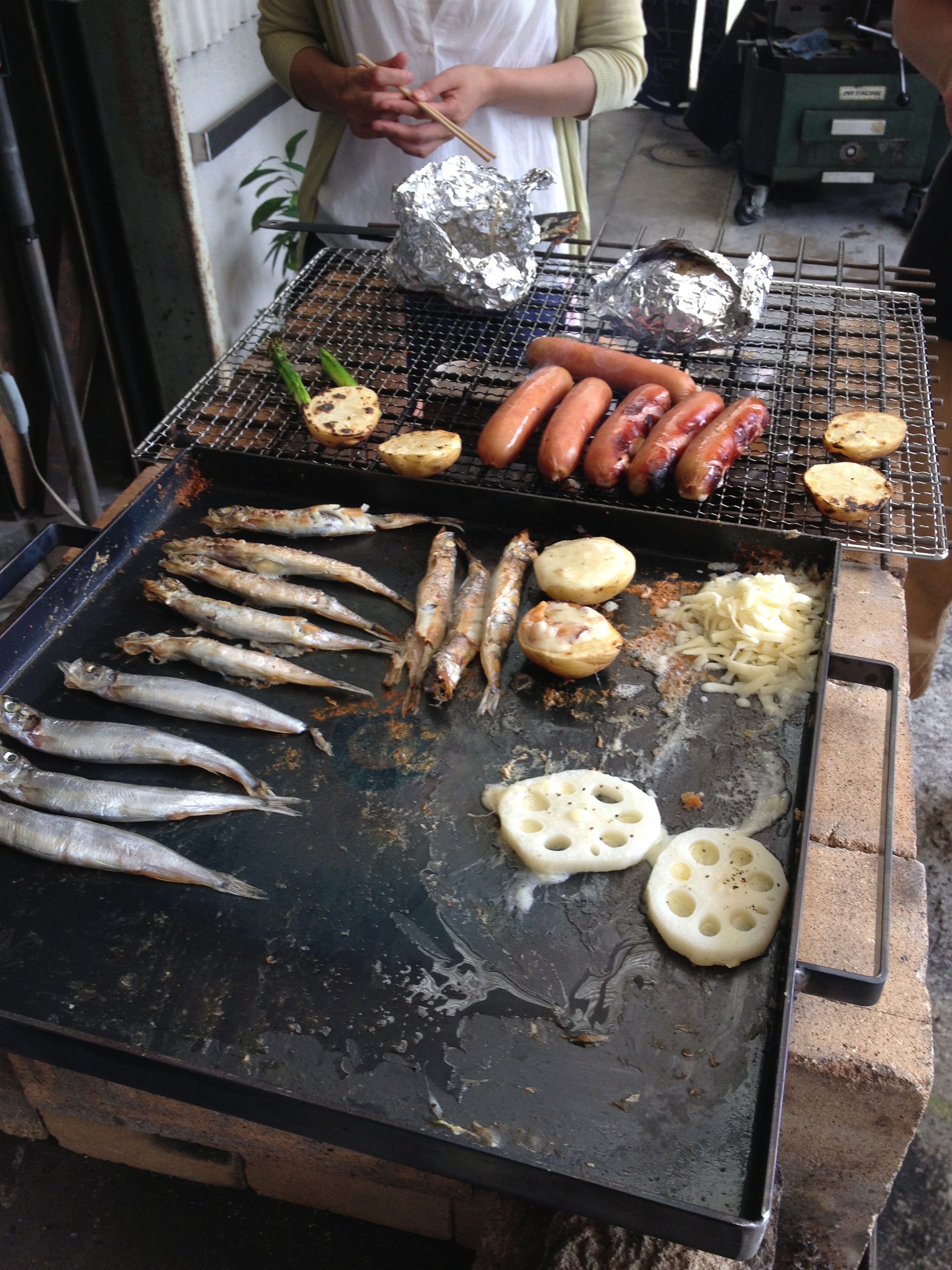 今回のために作った鉄板の上で、各自一品ずつ持ち寄った食材でBBQへ突入!